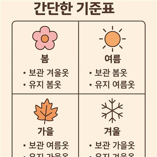 아래 표는 각 계절에 맞춰 어떤 옷들을 꺼내고 보관하면 좋을지 정리한 간단한 기준표입니다.