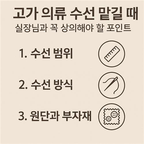 고가의류수선, 실장님상담, 명품수선, 수선주의사항, 의류소재관리, 고급원단수선, 수선견적, 수선기간, 포트폴리오확인, A/S정책