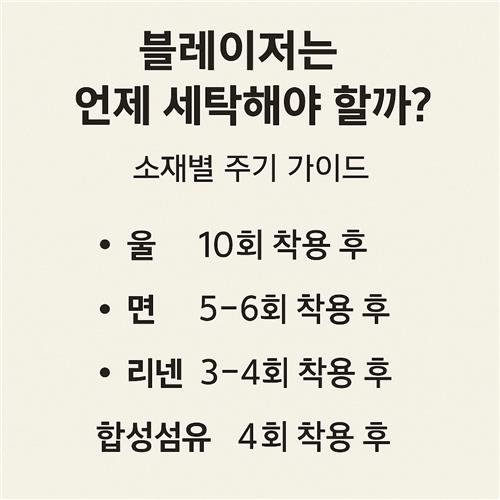 💡 TIP: 블레이저는 한 시즌(약 2~3개월)에 1~2회 정도 세탁하는 것이 적절해요. 자주 착용하는 경우에는 한 달에 한 번 정도 관리해주면 더 좋아요!