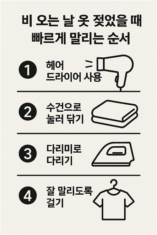 오늘은 비에 젖은 옷을 빠르게 말리는 실전 팁과 순서를 정리해보았어요.
