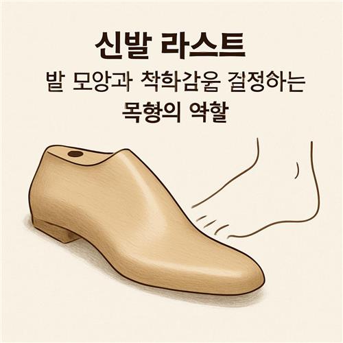 | 라스트 | 신발의 전체 형태, 폭, 높이, 곡률을 결정 | 발과 신발 사이의 기본 공간 설계, 발 모양과의 궁합을 좌우 | 같은 사이즈라도 브랜드마다 크게 다르게 느껴지는 근본 이유 |