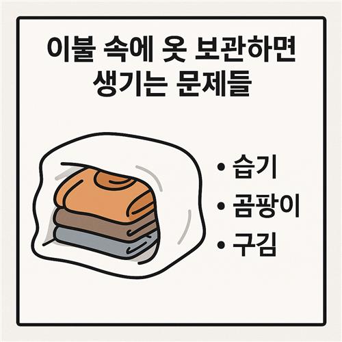 이불은 통기성이 떨어지고 내부 공기 순환이 거의 되지 않기 때문에, 그 속에 보관된 옷은 습기와 체온, 땀 등의 영향으로 쉽게 눅눅해질 수 있어요.