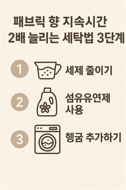 옷을 세탁하고 나왔을 때 잠깐만 향이 스쳐 지나가고, 하루만 지나도 아무 향이 남지 않아서 아쉬웠던 적 많으시죠? 섬유유연제는 분명 최상급 향으로 골랐는데, 정작 옷장에서 꺼내 입을 때는 아무 냄새가 안 나거나 눅눅한 빨래 냄새만 남는 경우도 있습니다. 사실 향기가 오래가지 않는 이유는 섬유유연제의 성능 부족이라기보다 세탁 과정의 순서와 습관인 경우가 훨씬 많아요. 이 글에서는 복잡한 장비나 비싼 제품 없이, 세탁 순서만 살짝 바꿔도 패브릭 향 지속시간을 최대 2배까지 늘릴 수 있는 실전 세탁법 3단계를 차근차근 정리해 드릴게요. 집에서 당장 따라 할 수 있도록 단계별 체크포인트도 함께 담았으니, 끝까지 읽고 오늘 세탁에 바로 적용해 보세요.