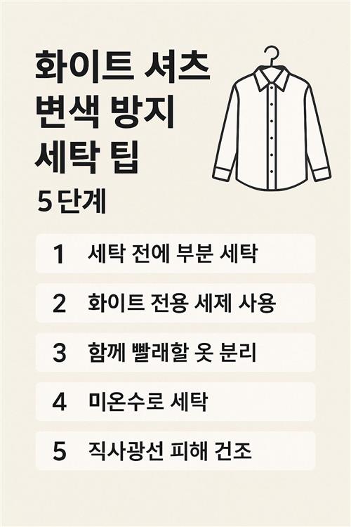 하얀 셔츠는 작은 얼룩이나 미세한 누런 기운에도 금세 티가 나죠. 세탁을 자주 해도 오히려 누렇게 뜨거나 회색빛이 도는 경우가 많아 답답함을 느끼셨을 거예요. 이 글에서는 변색의 근본 원인을 쉽게 풀어 설명하고, 가정에서 바로 실천 가능한 5단계 세탁 루틴을 알려드립니다. 세제 선택부터 물 온도, 표백제 사용 순서, 건조와 보관까지 체계적으로 정리했으니, 끝까지 따라 하시면 새하얀 셔츠의 선명함을 오래 유지할 수 있습니다. 각 단계는 초보자도 실수 없이 실행할 수 있도록 체크리스트와 표로 구성했습니다.