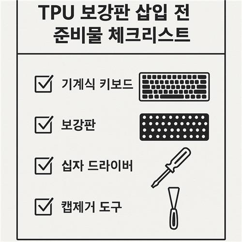 TPU 보강판을 제대로 삽입하기 위해선 몇 가지 필수 준비물이 필요합니다. 이 준비물들은 단순한 도구를 넘어, 작업의 품질과 안정성에 직접적인 영향을 주기 때문에 반드시 사전에 모두 준비해두는 것이 중요합니다.